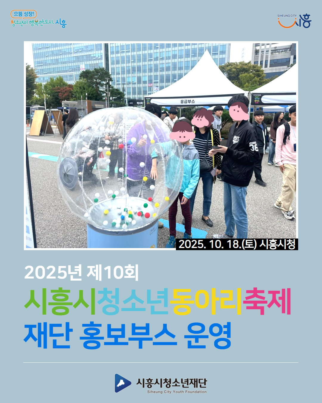 - 공지 [안내] 제10회 시흥시청소년동아리축제 & 제4회 시흥시 전국청소년e스포츠대회 2025-10-17 14:48:07 152 안녕하세요 시흥시청소년재단입니다. 10/18(토) 시흥시청에서 제10회 시흥시청소년동아리축제 & 제4회 시흥시 전국e스포츠대회가 진행됩니다. 청...