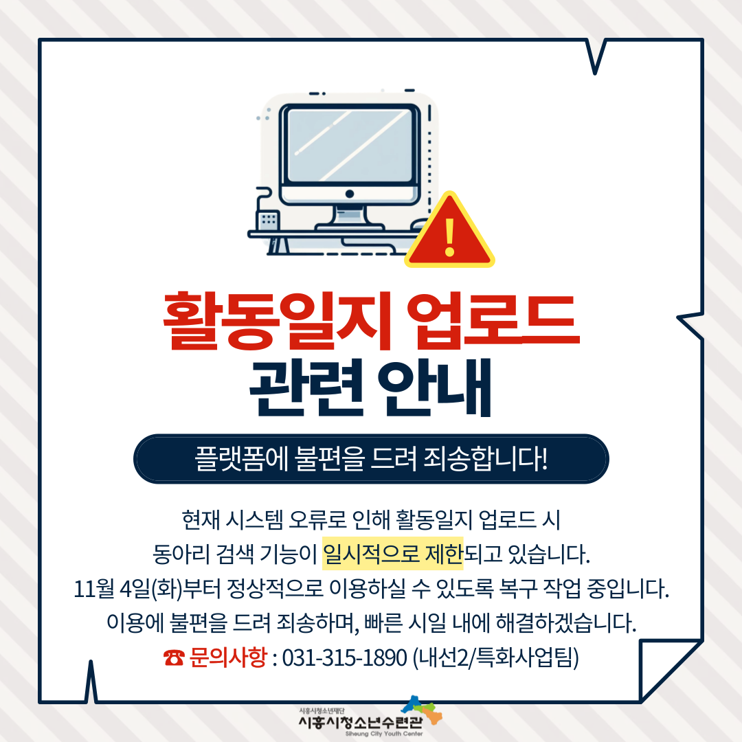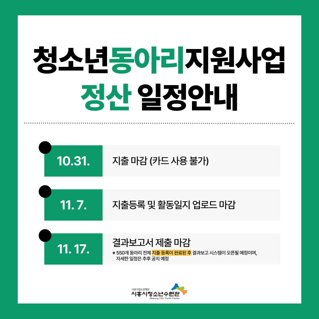 - [안내] 2025년 시흥시청소년동아리지원사업 정산 및 사업 마감 일정 안내 [안내] 2025년 시흥시청소년동아리지원사업 정산 및 사업 마감 일정 안내 2025.10.31