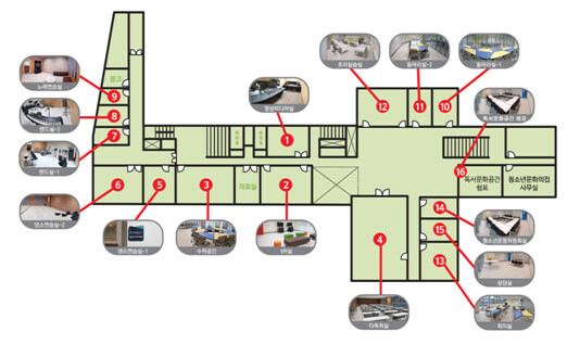 | 3층 | 댄스연습실 1 | · 음향시설과 전면 거울이 부착되어있어, 댄스, 연극 활동이 가능한 공간 | 50.35 | 10명 | |