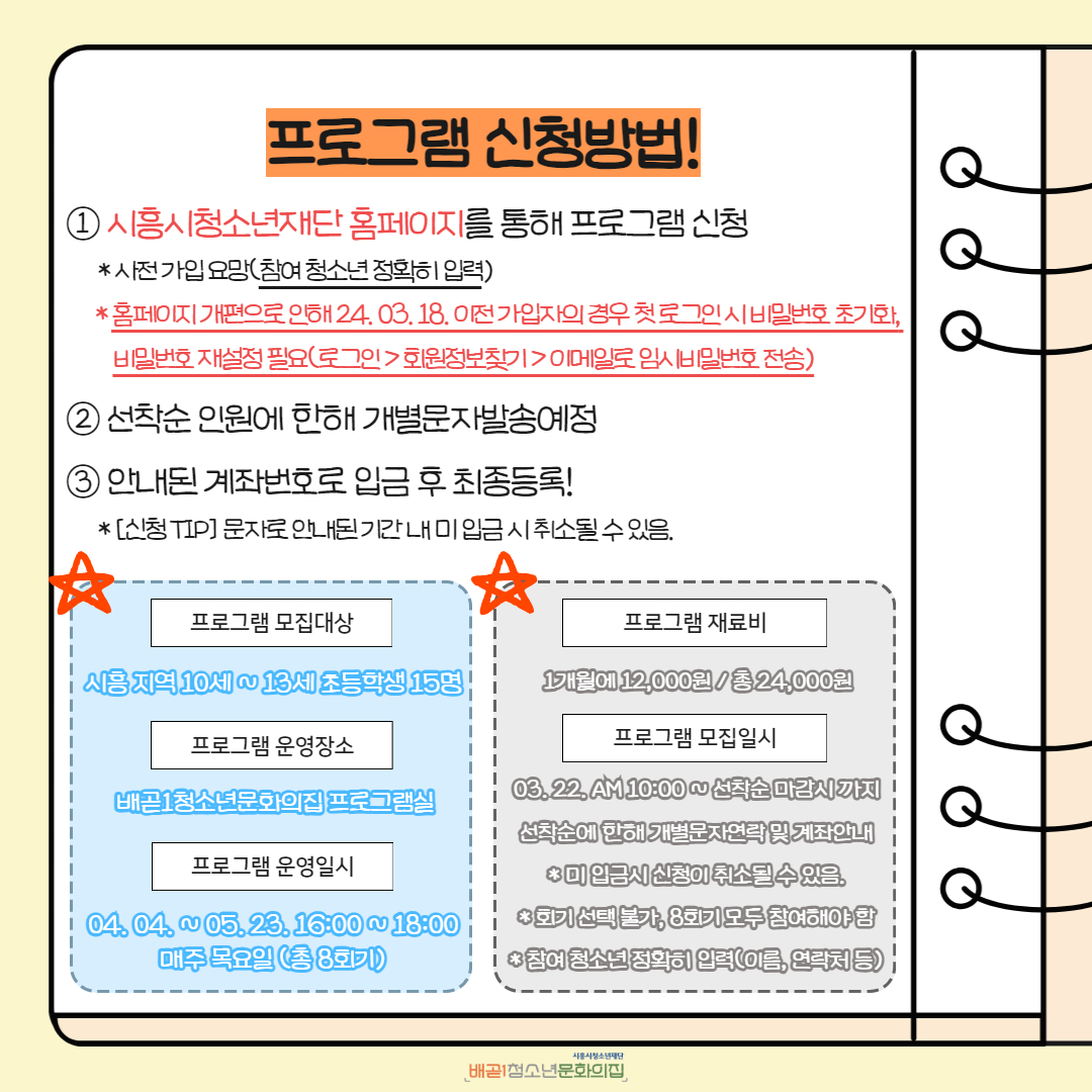 - 프로그램 신청 전 '시흥시청소년재단' 사전 가입 필수이며, 기존 홈페이지 가입자의 경우 홈페이지 개편으로 인해 비밀번호 재설정이 필요합니다.(24. 03. 18. 이전가입자)