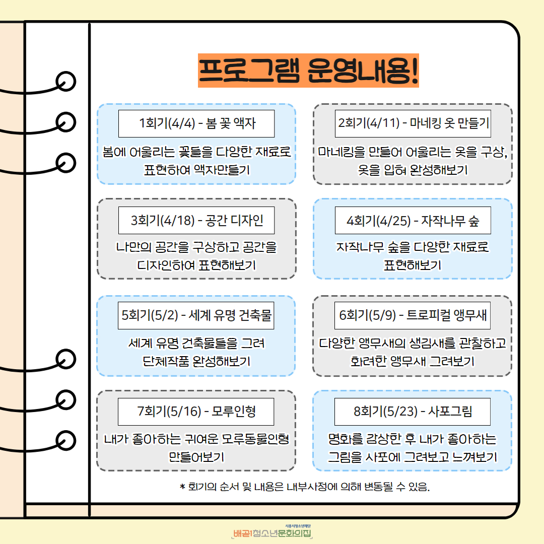 - 개인 사정에 의한 회기 불참 시 환불 및 개인 재료 제공은 불가합니다.