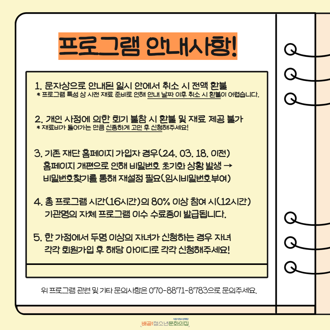 * 프로그램 특성 상 사전 재료 준비로 인해 안내된 날짜 이후 취소 시 환불이 어렵습니다.