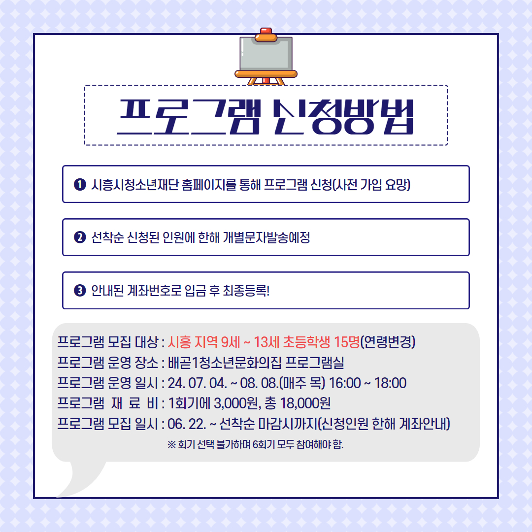 - 프로그램 신청 전 '시흥시청소년재단' 사전 가입 필수이며, 기존 홈페이지 가입자의 경우 홈페이지 개편으로 인해 비밀번호 재설정이 필요합니다.(24. 03. 18. 이전가입자)