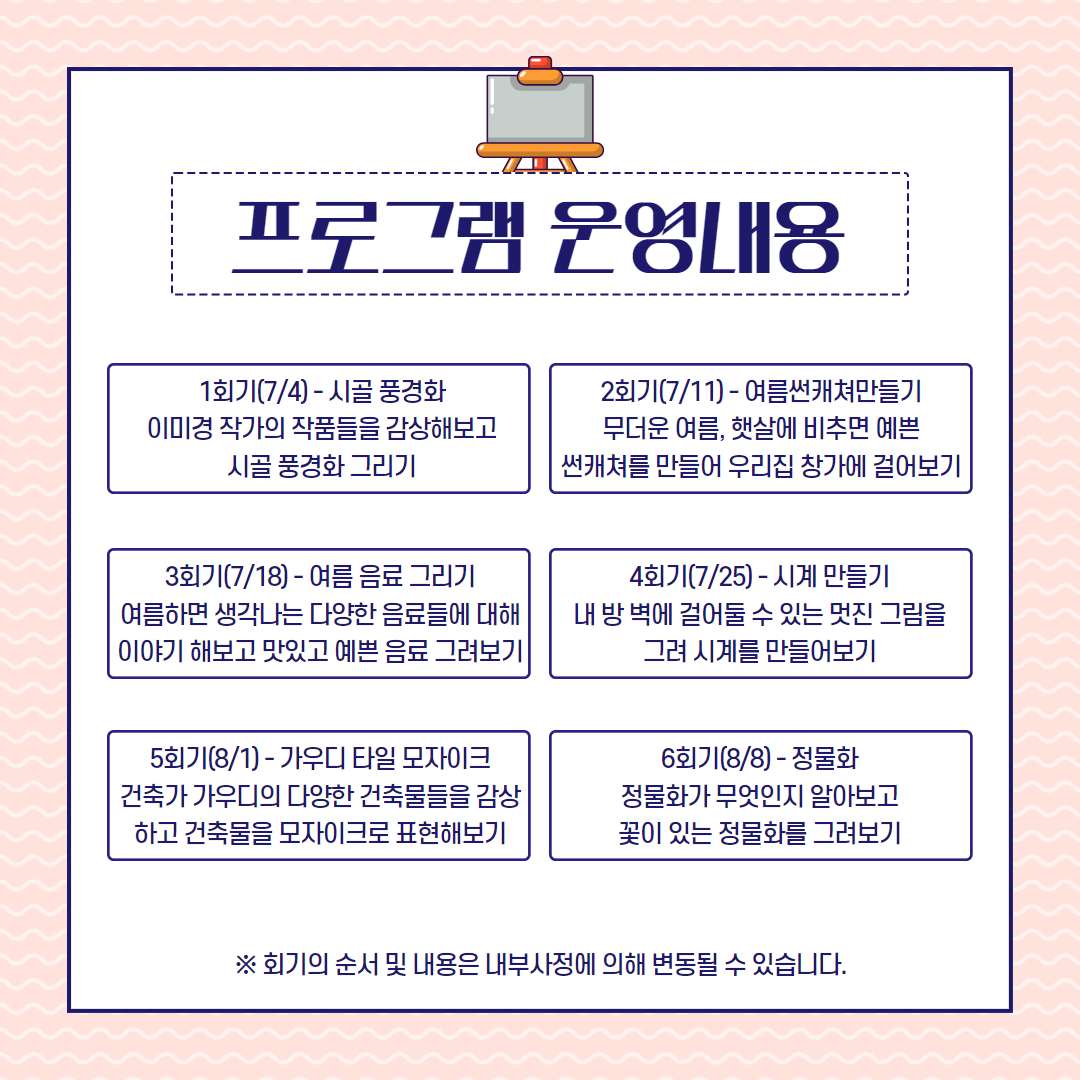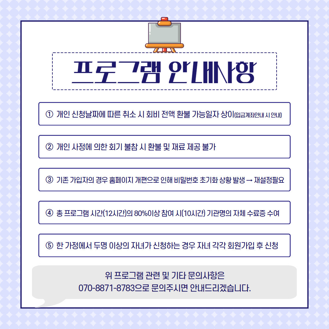 * 프로그램 특성 상 사전 재료 준비로 인해 안내된 날짜 이후 취소 시 환불이 어렵습니다.