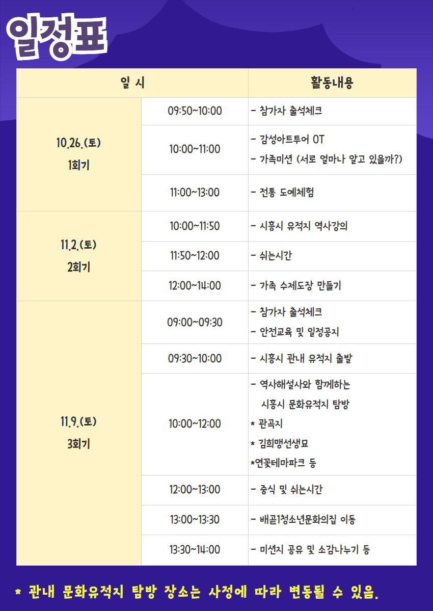활동장소: 배곧1청소년문화의집 및 시흥시 관내 문화유적지 등